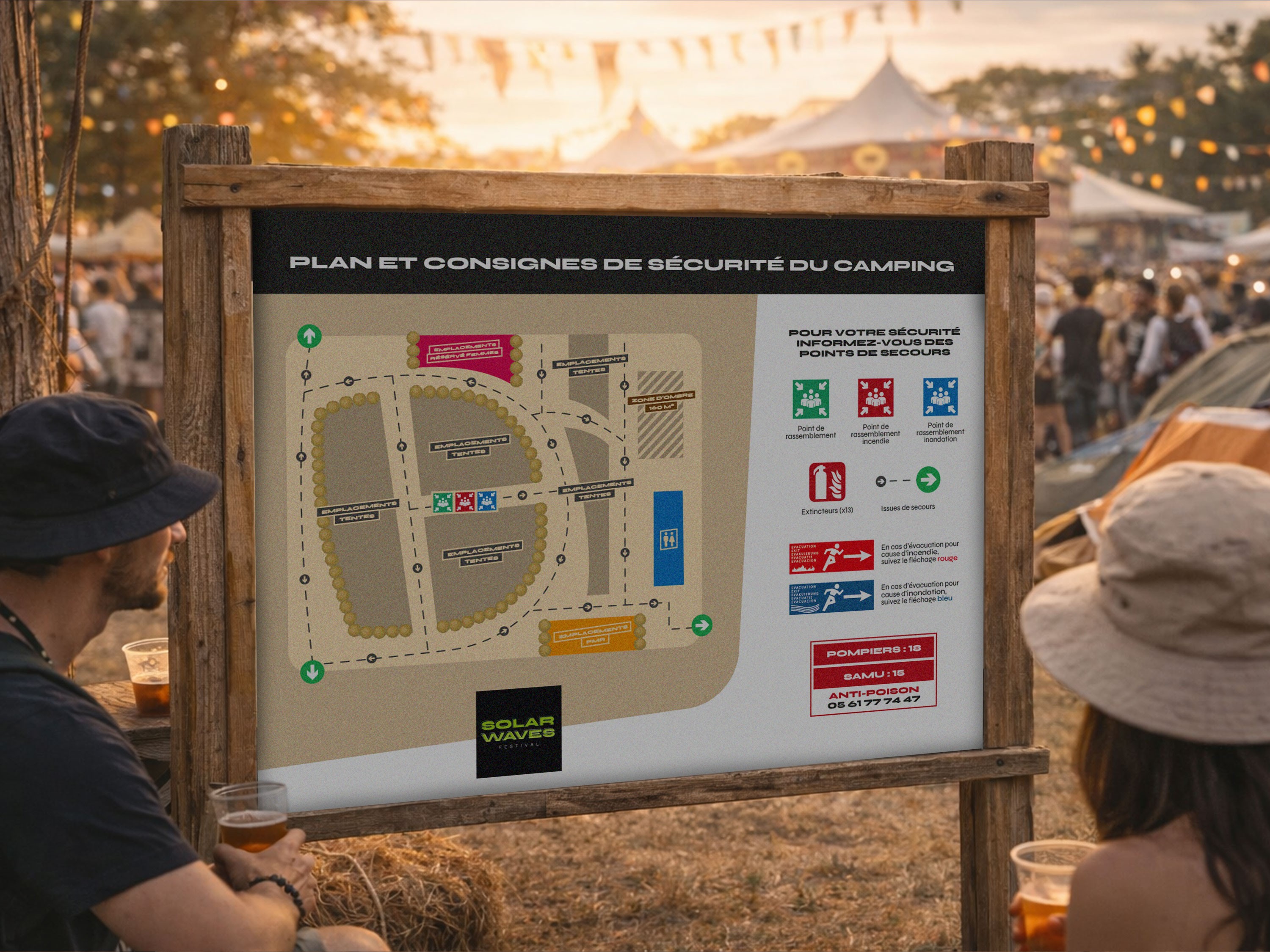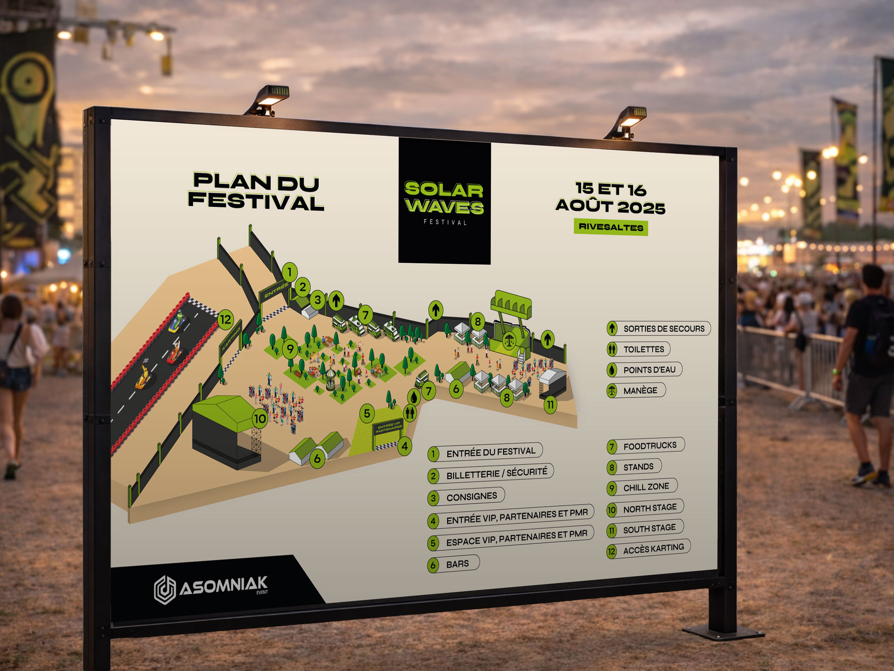 Solar Waves Festival est un événement accueillant un large public, nécessitant des supports clairs pour orienter les festivaliers et faciliter leur expérience sur site.